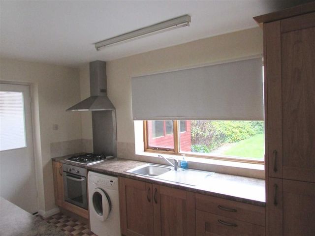 12'8 x 7'6 (3.86m x 2.29m)Fitted with a matching range of base and eye level units with worktop space over, stainless steel sink unit with single drainer and mixer tap, plumbing for automatic washing machine, fitted electric oven, built-in four ring gas hob with extractor hood over, sealed unit double glazed window to rear, radiator, door to side pasageway: