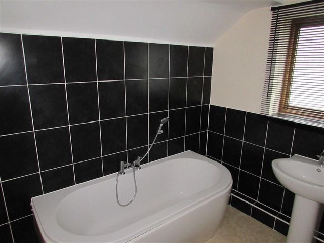 Recently refitted with two piece suite comprising bath with shower attachment and pedestal wash hand basin, frosted sealed unit double glazed window to rear, heated towel rail.