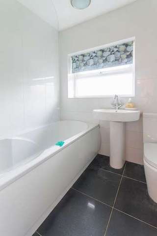 Having a uPVC double glazed obscured window to the rear elevation, white three piece suite comprising: pedestal hand wash basin with mixer tap, low level W.C, panelled bath with mixer tap and direct shower over, fully tiled walls, chrome heated towel rail and tiled flooring.