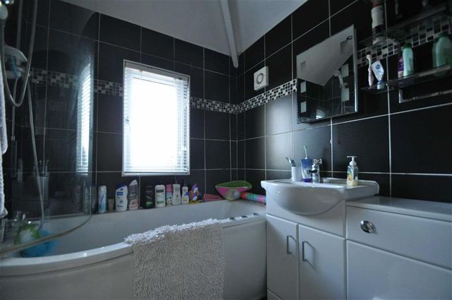 Rear facing uPVC double glazed window. Ceiling mounted spotlights. Panel enclosed jacuzzi bath with shower over. Pedestal wash hand basin with storage cupboards under. Low level flush WC. Fully tiled walls. Extractor fan. Heated chrome towel rail. Tiled flooring.