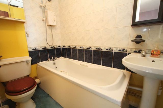 White suite of WC, washhand basin, bath with electric shower, partially tiled walls, extractor fan. Shaving point.
