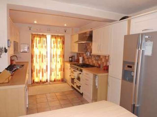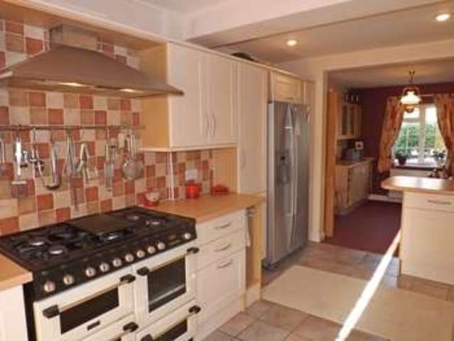 Good-sized double aspect room with double-glazed window to front elevation in breakfast area and double-glazed FRENCH DOORS to rear elevation in kitchen area opening on to decking and overlooking rear garden. Ceramic tiled flooring in kitchen area. Range of fitted SHAKER STYLE base and wall units with co-ordination wood effect worktops incorporating stainless steel 1.5 bowl single drainer sink unit with chrome mixer tap over. Half tiled walls. Freestanding CANON DOUBLE OVEN 6-RING GAS RANGE COOKER (included in sale) with tiled splashbacks and stainless steel DOUBLE CHIMNEY EXTRACTOR HOOD over. Space and plumbing for dishwasher. BREAKFAST BAR with further base units under. Space for American fridge/freezer. Inset ceiling spot lights. There is a radiator in the breakfast area and a further range of co-ordinating base and wall units incorporating TWO WINE RACK BASE UNITS and two glass fronted display wall units with glass shelving. Telephone point. Alarm control panel. Alarm sensor. Panelled door from kitchen area to: