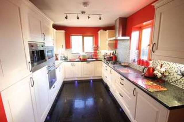 Having wall cupboards, a range of base units with worktops over, stainless steel sink & drainer, tiled splash backs, five ring gas fire with extractor over, integrated appliances to include; electric oven, fridge/freezer, dishwasher, microwave and coffee machine, double glazed windows to the side & rear, radiator, two ceiling light points, power points and door to: