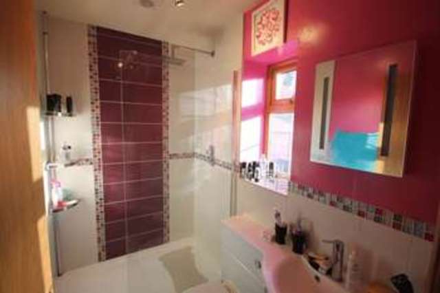 Having W.C with hidden cistern, hand basin set in vanity unit, walk-in shower, tiled splash backs, chrome towel radiator, ceiling light point, extractor and double glazed window to the side.