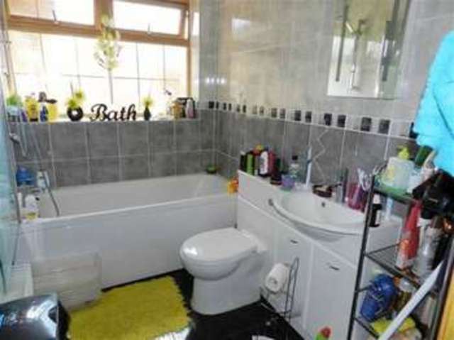 Having W.C with hidden cistern, hand basin set in vanity, panel bath with shower over, full tiling to walls, chrome towel radiator, ceiling light point, extractor and obscured double glazed window to the side.