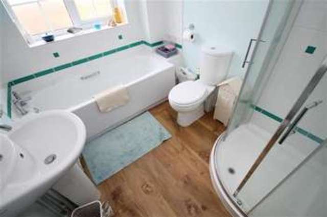 Wood flooring, part tiled walls, ladder style radiator, wall mounted cabinet and mirror, mounted spotlights. Modern fitted suite comprising panelled bath with mixer taps, pedestal wash hand basin with mixer taps, close coupled w.c and a separate corner shower with wall mounted attachments.