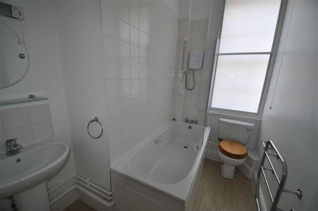 Front facing obscure window. Ceiling light point. Panel enclosed bath with shower over. Pedestal wash hand basin. Low level flush WC. Part tiled walls. Chrome towel rail. Coving.
