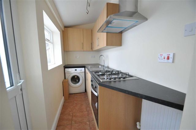 9'11 x 4'1 (3.02m x 1.24m)Side facing single glazed window. Eye level and base storage units will roll edge work surfaces over. Stainless steel sink unit with mixer tap over. Built in electric oven. Gas hob. Extractor hood. Plumbing for washing machine. Built in fridge. Ceiling light point. Radiator. Tiled flooring.