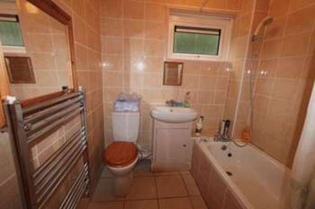 Three piece bathroom suite comprising panelled bath with mixer tap, mains operated shower over, wash handbasin, low level w.c., chrome towel rail, double glazed window to the side elevation.