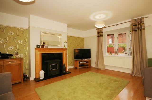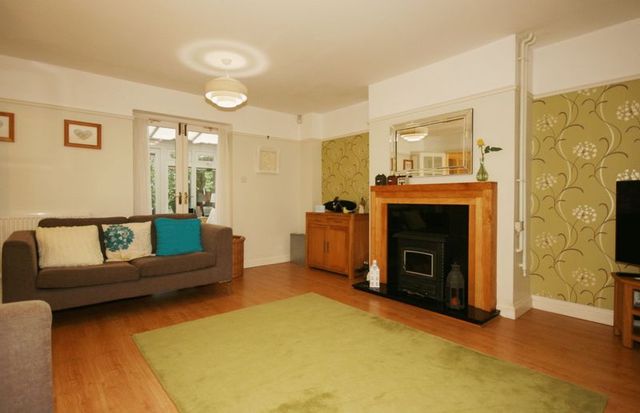The focal point of this living room is the fireplace housing the multi-fuel burner stove with back boiler, oak wooden surround and granite inlay and hearth. There is a TV aerial point, two central heating radiators, wood-effect laminate flooring and a double glazed bay window to the front. Double doors lead through into the...
