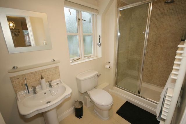 A three-piece white suite comprising: a single-flush toilet, pedestal wash hand basin with hot and cold taps and tiled splashbacks, and a double shower cubicle with chrome mains shower over and sliding glazed door. There is a centrally heated towel rail, vinyl flooring, extractor fan and an opaque double glazed window to the rear.
