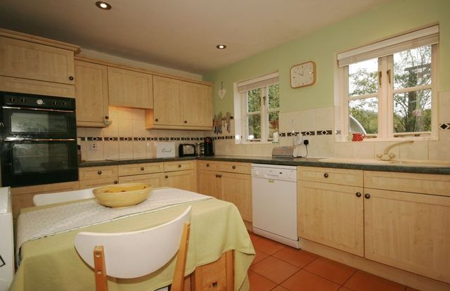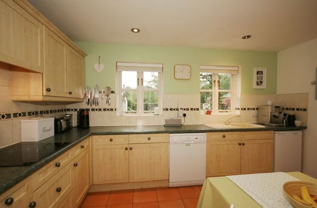 Featuring a range of wall and base level units, sink drainer unit with mixer tap, laminate roll-top work-surfaces and tiled splashbacks. There is an electric fan assisted double oven and grill, inset four-ring induction hob with extractor hood over and space and plumbing for a dishwasher and fridge. There is tiled flooring, a central heating radiator and two double glazed windows over looking the rear garden. Door leading through into the...