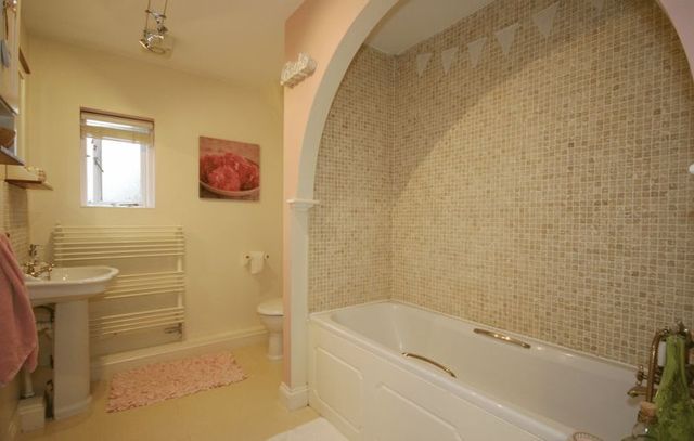 A white three-piece bathroom suite comprising: a single-flush toilet, pedestal wash-hand basin with hot and cold taps, white panelled bath with hot and cold taps and a hand-held shower attachment. There's a centrally heated towel rail, vinyl flooring, extractor fan and an opaque double glazed window to the side elevation.
