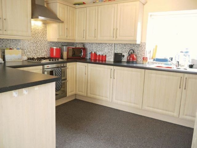 Good range of modern fitted base and wall units with contrasting work surfaces, tiled splash backs, stainless steel sink and mixer tap. Integrated gas oven and hob with extractor hood. plumbed for washing machine & dishwasher. uPVC double glazed window.