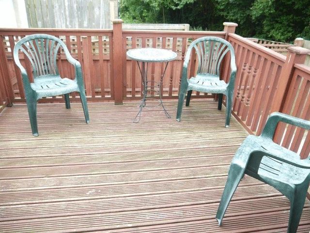 CH radiator, uPVC double glazed window and uPVc double glazed French doors leading out onto the decked area. Open to: