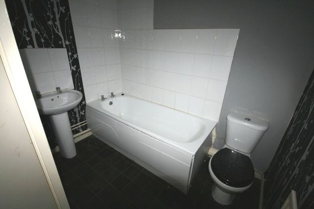 White suite comprising WC, wash basin and bath and splash back tiling.