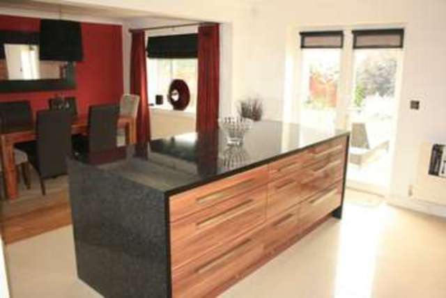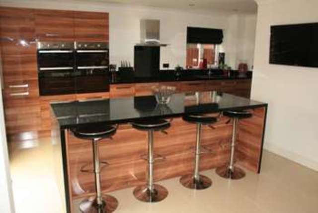 KITCHEN DINER : 13'1" x 22'9" (3.99m x 6.93m) , Extensive range of quality units in glossy plum wood with complimentary black quartz effect worksurfaces and ceramic splash-backs. Integrated Franke granite anthracite single bowl and drainer. Two integrated Hotpoint black glass electric double oven and grill with Ceran halogen hob with a stainless steel extractor hood over. Integrated dishwasher, tall larder cupboard and led kick-board lighting to porcelain flooring. Recess housing plumbing for an American style fridge freezer. Feature preparation island with breakfast bar facility. Recess down-lights to ceiling. uPVC double glazed window and patio doors to rear elevation. 2 radiators, wall mounted television point. uPVC double glazed window to side elevation. Half glazed door to: