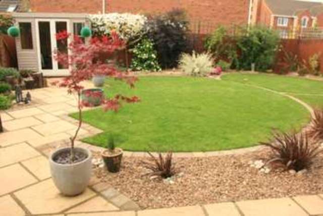 REAR GARDEN : 40' x 44' (12.19m x 13.41m) , Flood-lamp lighting over landscaped garden with feature lawn circles with block edgings to shrubs and planted sculptured borders, stocked with avariety of shrubs and plants and filled with washed gravel. Roughcast flagstone pathways and patio area. Timber sleeper towers to alpine rockery. Timber Summer Shed. Close lap fenced boundaries. External power point and tap.
