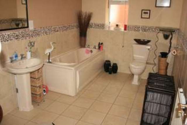 BATHROOM : 12'7" x 7'9" (3.84m x 2.36m) , 4 piece suite in soft creme comprising of a low level W.C, wash hand pedestal, panelled bath and shower cubicle incorporating a thermostatic shower unit and laminated enclosure screen. Ceramic tiled splashbacks and flooring. Recess down-lights to flat ceiling. Radiator, uPVC double glazed window to rear elevation. Shaver point.