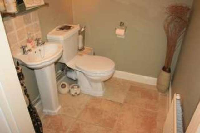CLOAKROOM : 5'2" x 5'1" (1.57m x 1.55m) , 2 piece suite comprising of a low level W.C and wash ahnd pedestal. Ceramic tiled flooring, radiator, coved ceiling.