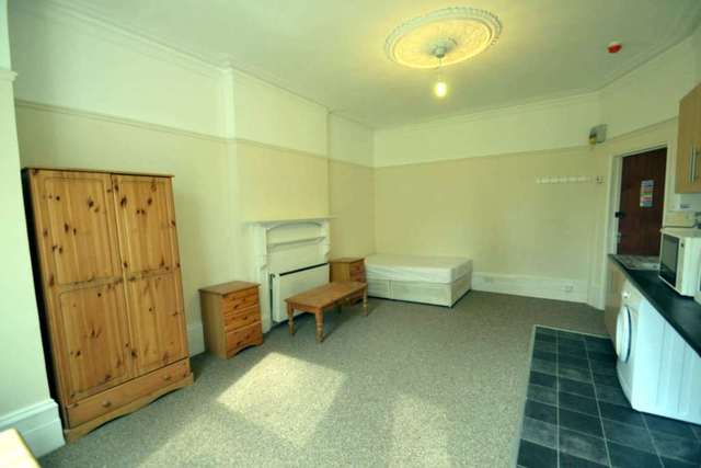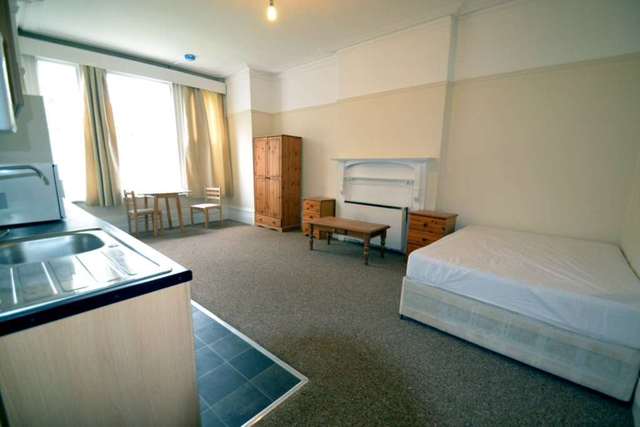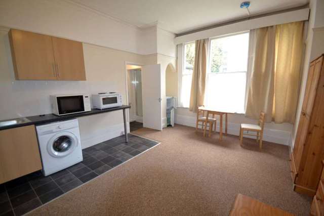 A double studio room, on the ground floor, incorporating a kitchen, with sink, Belling oven, hot water heater, refrigerator and washing machine. Separate own shower bath and toilet