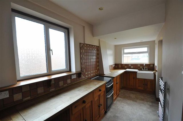 Rear and side facing uPVC double glazed windows. Base storage units with wooden work surfaces over. Belfast sink with mixer tap over. Electric cooker point. Plumbing for washing machine. Further appliance space. Side facing door to conservatory. Heated chrome towel rail.
