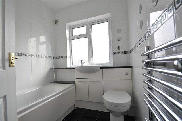 Rear facing uPVC double glazed window. Ceiling mounted spotlights. Panel enclosed bath with shower over. Vanity wash hand basin with storage under. Low level flush WC. Fully tiled walls. Extractor fan. Heated chrome towel rail. Tiled flooring.