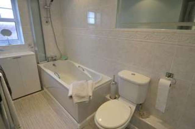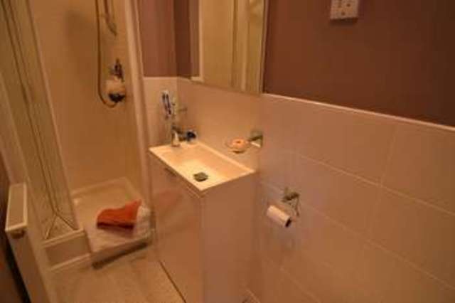 Having a matching suite comprising of low level WC, wash hand basin set into vanity unit, shower cubicle, central heating radiator and lino flooring