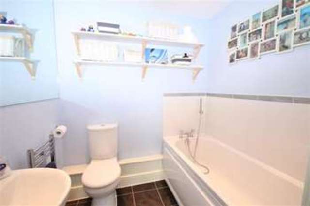 BATHROOM: panel enclosed bath with mixer taps and shower attachments, wash hand basin &m mixer taps, low level flush WC, chrome heated towel rail, slate effect 'Amtico' floor, extractor fan, down lights, shaving point & mirror