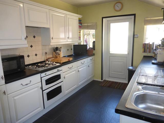 KITCHEN3.58m (11' 9") x 2.72m (8' 11")Double glazed window to side, double glazed door to rear, stainless steel sink unit with cupboards under, matching wall and base units with work surfaces over, built in oven and hob, tiled splash back, integrated fridge freezer, plumbed for washing machine, radiator.