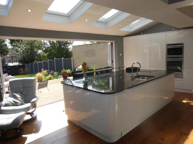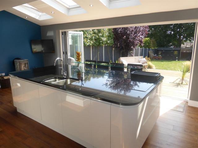 KITCHEN/BREAK FAST ROOM6.81m (22' 4") x 4.34m (14' 3") narrowing to 3.68m (12' 1")4 Velux windows, double glazed bi fold doors to rear, centre island incorporating sink unit with hot water tap and hob with base units with granite work surfaces over, range of built in units with integrated oven and place warmer, microwave oven, integrated fridge and dishwasher, glass breakfast bar, log burner, under floor heating, laminate flooring.