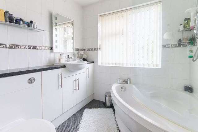 Having a uPVC double glazed obscured window to the front elevation, white three piece suite comprising; vanity hand wash basin, low level W.C, feature curved corner panelled bath with with electric shower over, fully tiled walls, chrome heated towel rail, down lighting and tiled flooring.
