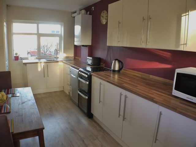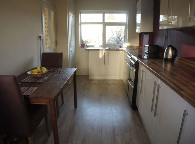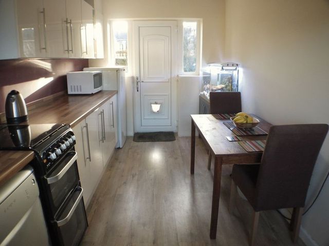 UPVc double glazed window to the front aspect, UPVc door and windows to the rear aspect. Range of eye and base level storage units with worksurfaces over incorporating single sink and drainer unit. Gas cooker and hob, under-stairs storage cupboard with plumbing for washing machine. Space for dining table and seating.