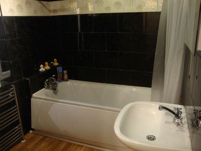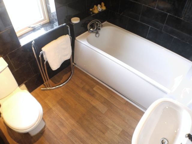 UPVc double glazed frosted glass window to the front aspect, bath with electric shower over, hand wash basin and low level wc.