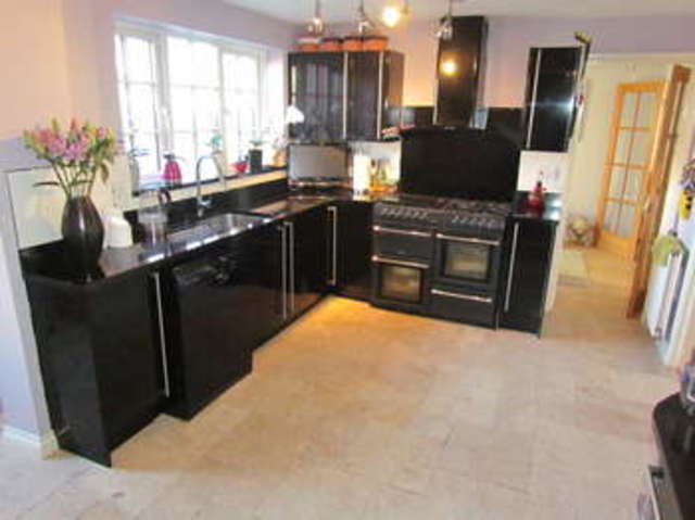 This contemporary style kitchen comprises black high gloss base and eye level work units, set to a granite work surface and splash back and additional tiled surround. Space for an eight ring Range master with overhead extractor and backsplash. Built in stainless steel sink with swan neck mixer tap and additional spring pull nozzle with drainer set into granite work surface. Space for a large American fridge freezer and dishwasher. Built in wine cooling fridge, UPVC window to rear aspect overlooking garden and UPVC glazed door leading out onto rear garden, ceiling mounted light fittings, travertine flooring and dual double radiators. Wooden double doors providing access to utility room and wooden door providing access to under stairs storage cupboard.