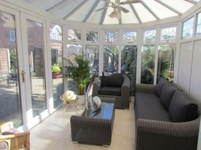 Full length windows wrapping around the conservatory and additional opening windows above, double doors leading out onto patio garden area, travertine flooring, pendant hanging light fitting with complementary assisted fan and wall mounted contemporary white radiator.