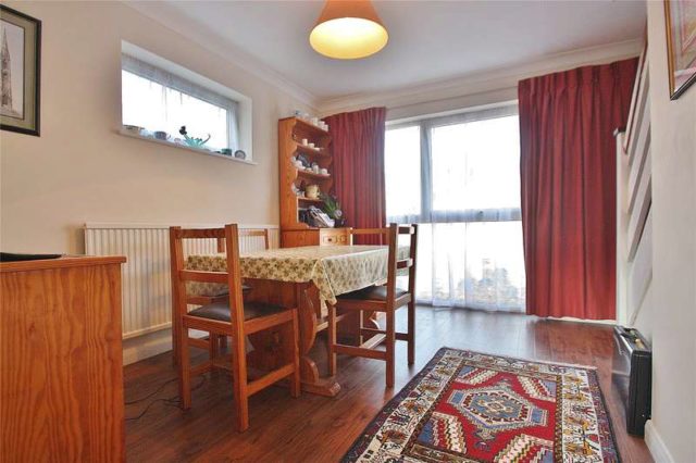Dining Room Front aspect double-glazed window, laminate wood flooring, stairs to first floor landing, door to understairs storage housing intruder alarm controx box with sensors in dining room, living room and first floor landing, radiator, door into: