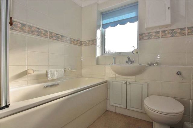 Bathroom Rear aspect double-glazed frosted window, three piece suite comprising panel enclosed bath with hot and cold mixer taps and shower attachment, wash hand basin, low level WC, tiled walls, radiator.