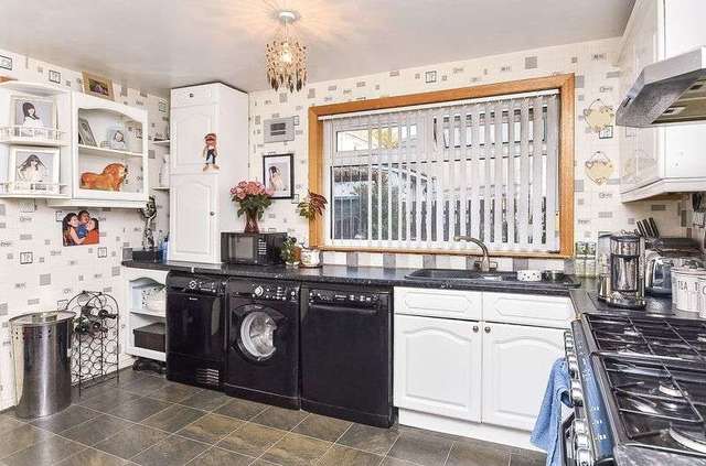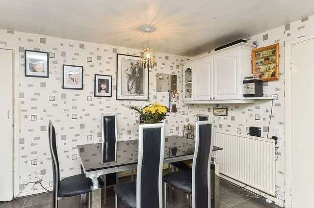 Set off the entrance hall with a window overlooking the garden, this spacious dining kitchen is fitted with a range of wall and base units with laminate worktops, sink and drainer, and splashback tiling. There is ample space for a range of appliances, with tile-effect laminate flooring, radiator, TV point, pendant light fittings and a deep walk-in larder cupboard.
