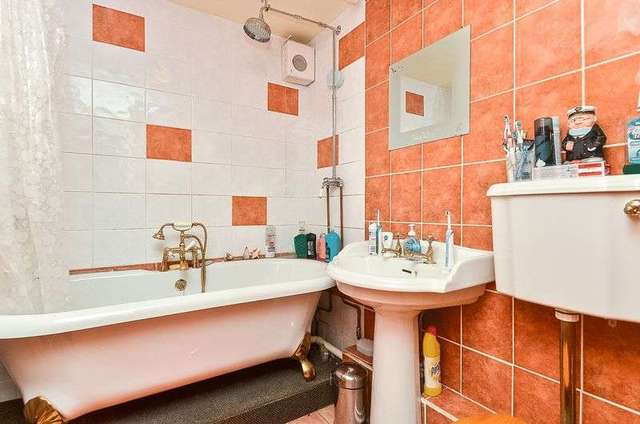Set internally, off the first-floor landing, this fully-tiled bathroom is fitted with a white, three-piece, heritage-style suite including a double-ended, claw-foot bath with rain-head mixer-shower, and a radiator, extractor fan and ceiling light fitting.
