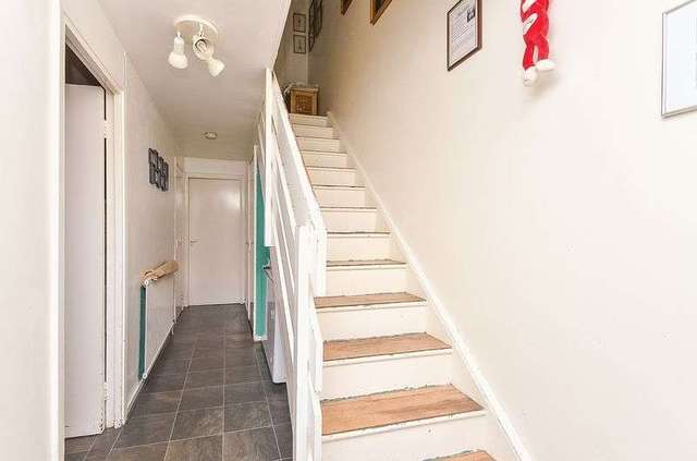 Serving the ground-floor rooms, and with a wooden staircase rising to the upper storeys, the entrance hall benefits from a deep, walk-in cupboard, currently used as a study, and from a cloakroom adjacent to the living room. Features include tile-effect laminate flooring, understairs space, radiator, smoke alarm and spotlights.