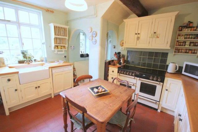 Beautifully crafted kitchen having worksurfaces with base units below comprising of drawers and cupboards, range of wall mounted cupboards, fitted 'Range' with tiled splashback, integrated dishwasher, inset Belfast stone sink with antique style mixer tap , quarry tiled floor, beamed ceiling, two stained glass windows overlooking the rear, additional window and trap door which gives access to the cellar.
