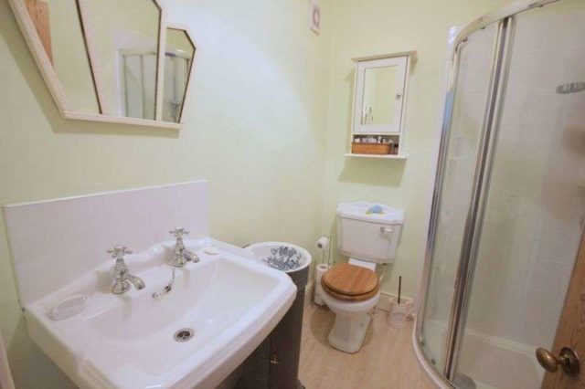 Having a suite comprising of shower cubicle having fitted shower unit, low level WC and pedestal wash hand basin with a tiled splashback. Coved cornice to ceiling, extractor fan and column radiator/heated towel rail.