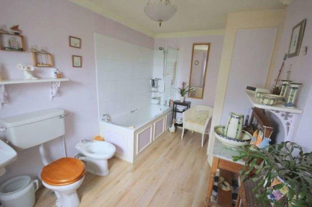 With suite comprising of panelled bath with shower unit above having glazed shower screen and tiling around the bath, low level WC, pedestal wash hand basin and bidet. Wood laminate flooring, airing cupboard, coved cornice to the ceiling and window to the rear elevation