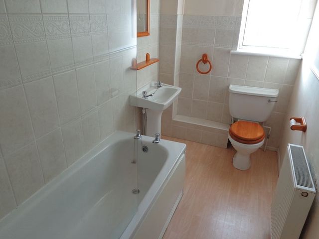 Obscured UPVC double glazed window to side aspect, suite comprising low level W.C, pedestal wash hand basin & panelled bath with wall mounted shower over, part tiled walls & raidator.