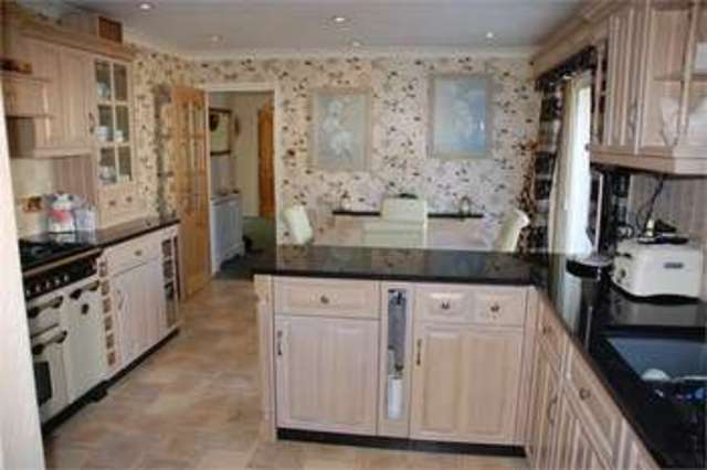 uPVC double glazed window to rear aspect. Kitchen comprises a range of limed Oak fitted units with granite worktop surfaces over. Built in wine rack. Integrated larder fridge with storage cupboards above. Built in Neff Oven/Microwave. Downlighters. Matching range of wall mounted cupboards and display cabinets. Inset granite one and a half bowl sink drainer unit. Part tiled walls.