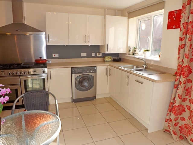 Double-glazed window fitted with roller blind to rear elevation. High gloss ceramic tiled flooring. Double-glazed FRENCH DOORS to rear elevation opening to patio area and rear garden. Good range of contemporary high gloss fitted base and wall units with co-ordinating worktops and upstands incorporating stainless steel 1.5 bowl single drainer sink unit with chrome mixer tap over. Freestanding LARGE STAINLESS STEEL 'RANGEMASTER' ELECTRIC RANGE COOKER INCORPORATING 6-RING GAS HOB with stainless steel splashback and LARGE STAINLESS STEEL 'RANGEMASTER' CHIMNEY EXTRACTOR HOOD over. Space for tall fridge freezer. INTEGRATED DISHWASHER. Space and plumbing for washing machine. Control panel for ground floor heating system. L-Shaped to: