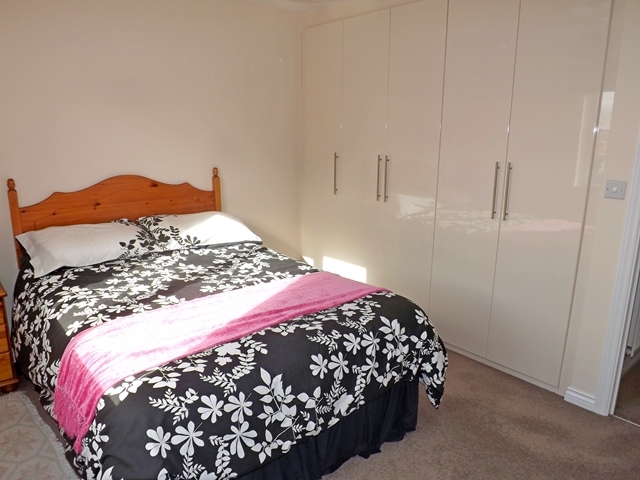 Double-glazed window fitted with roman blind to rear elevation. Radiator. RANGE OF BUILT-IN WARDROBES. Switch for exterior garden lighting. Door to:
