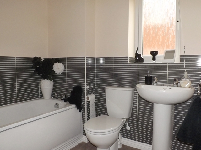 Obscure double-glazed window fitted with roman blind to side elevation. White suite comprising panelled bath with chrome taps, pedestal wash hand basin with chrome taps and low level WC. Contemporary half-tiled walls. Extractor fan. Radiator.