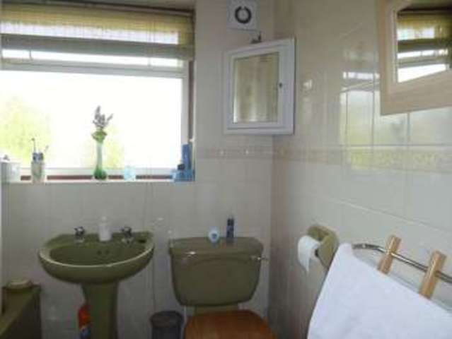 White suite with shower over the bath. Radiator. Double glazed window. Tiled walls.